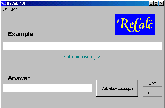 Try out ReCalc online at MixCalctm. ReCalc and MixCalc use the same calculator. The only difference is that MixCalc actually gives answers.